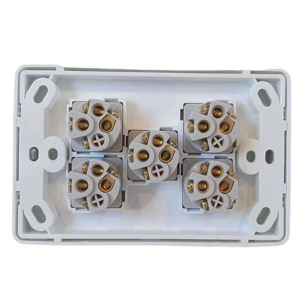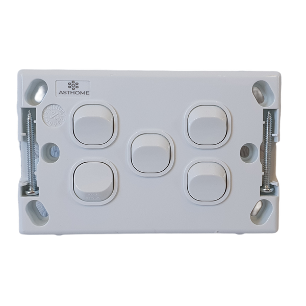 Standard 5 Gang 10A 250V Switch With Plate, White, Horizontal Identical to Trader Feral Cat Switches are two way with looping terminal and suit 4 x 1.5mm2 cabling with 4.1mm bore terminals #1 Phillips head combo screws for the terminals Fits standard Australian wall boxes and mounting accessories that use 84mm mounting centres Covers, plates and dollies are made from polycarbonate Plate is 13mm deep Standard Pack size - 10 5 Year Replacement Warranty SAA Approved Product
